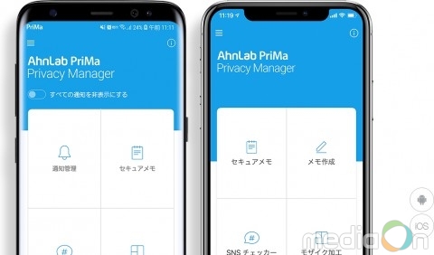 이번에 일본에서 출시된 안랩 프리마는 페이스북, 인스타그램, 트위터 등 소셜미디어와 연동된 서비스 관리 및 페이스북 개인정보 공개범위를 설정할 수 있는 ‘소셜미디어 보안’, 메모, 사진 등 미디어파일 내 민감 정보를 암호화 저장하는 ‘보안 메모’, 알림 메시지 내 악성URL/개인정보 검사 및 관리하는 ‘알림 검사’, 사진의 주요정보를 쉽게 가린 후 공유할 수 있는 ‘모자이크’ 등 다양한 개인정보보호 기능을 제공한다.