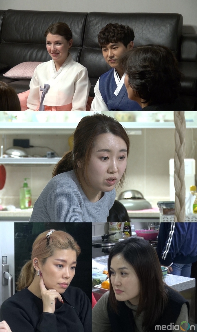 먼저 등장한 며느리는 러시아인 고미호. 결혼 후 처음으로 명절 음식 준비에 나선 미호는 시어머니에게 “스케줄 있어서 명절에 못 온다고 하면 안 된다”는 말을 들으며 부담이 커졌다. 이에 남편 경택이 “바쁜 일이 있으면 일을 관둬?”라고 반문했고, 순식간에 냉랭한 분위기가 감돌았다. 이어진 차례 시간. 경택과 나란히 앞에 선 미호에게 시어머니는 “남자 먼저”라며 한걸음 물러서게 했다. 이에 출연진은 준비는 여성이 했지만 막상 남성 위주로 진행되는 차례 문화가 가부장적인 명절의 모습인 것 같다고 이야기했다. 이를 본 김선영 미디어 평론가도 “며느리도 가족의 일원으로 행복할 수 있는 방안을 같이 노력했으면 좋겠다”고 당부했다.